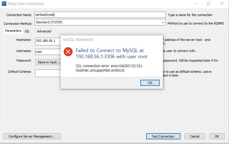 A000102:SSL routines::unsupported protocol이라고 발생하였으며 접속이 되지 않았습니다.
