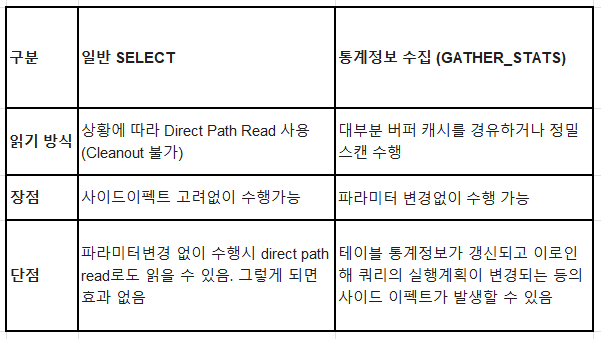 11g 이후에는 큰테이블을 읽을경우에는 direct path read를 사용하게 파라미터 설정이 되어 있게 됩니다.