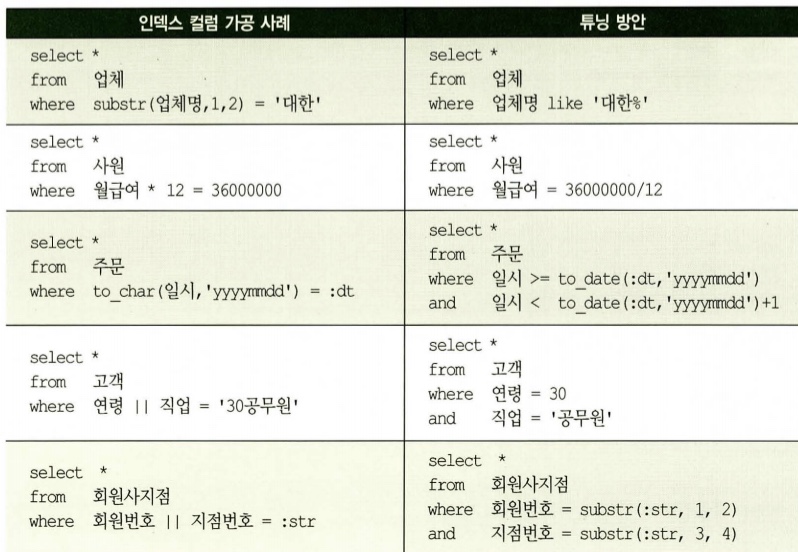 아래는 흔한 인덱스 컬럼 가공사례에 대한 튜닝 방안입니다.