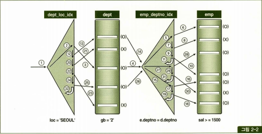 2.dept_loc_idx인덱스에서 읽은 rowid를 가지고 dept테이블을 액세스해 dept.gb=2필터조건을 만족하는 레코드를 찾습니다.