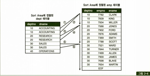 3.Sort Area에 정렬된 dept테이블을 스캔하면서 정렬된 emp테이블과 조인